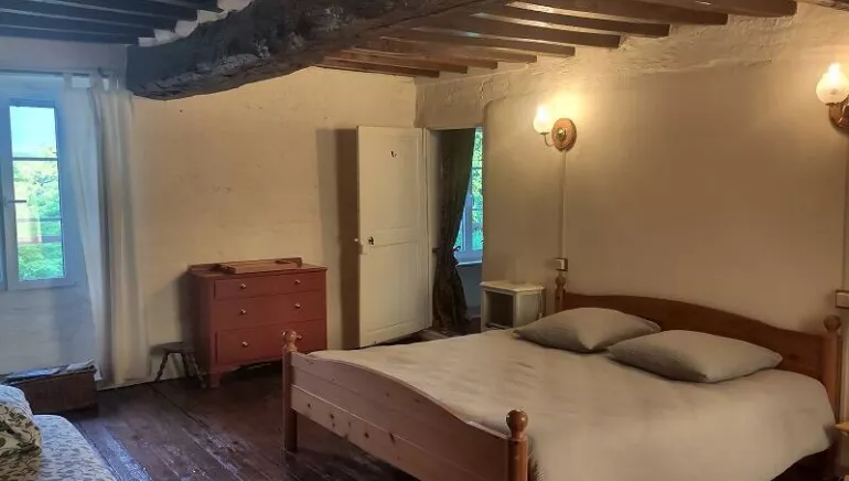 Large, typically Norman bedroom with exposed beams, oak parquet flooring and irregular walls that contribute to its charm. Large en suite bathroom with bath/shower, bidet, washbasin and toilet, located in an old farmhouse in a green area planted with apple trees. View over the garden and surrounding countryside. Car parking and bicycle storage (enclosed area).