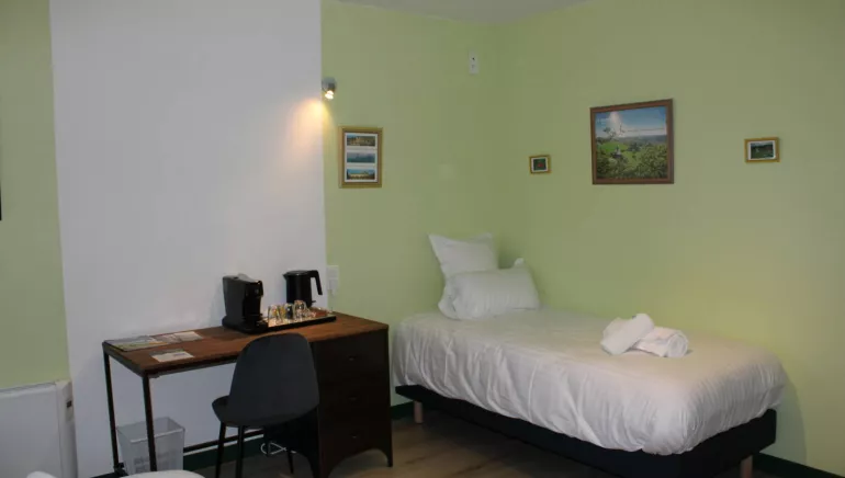 The guest room "Le Bocage" is located on the first floor. It is suitable for 4 people maximum (1 bed 140 and 2 beds 90). A shower room with WC is adjacent. There is no TV. Pets are not accepted.
