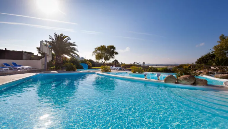 In an outstanding seaside setting of over 12 acres, this campsite right on the sea offers a large choice of holiday rentals and spacious pitches, bordered by hedges. A friendly, family atmosphere. Heated pool and water zone, GR34 coastal path for walkers, and farm animals in a landscaped area. Covered pool and heated toilet/shower block.