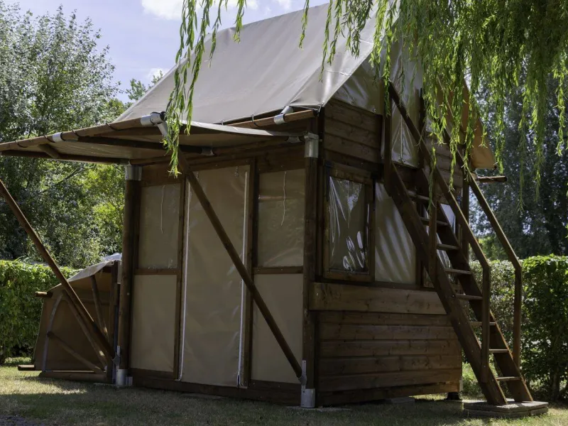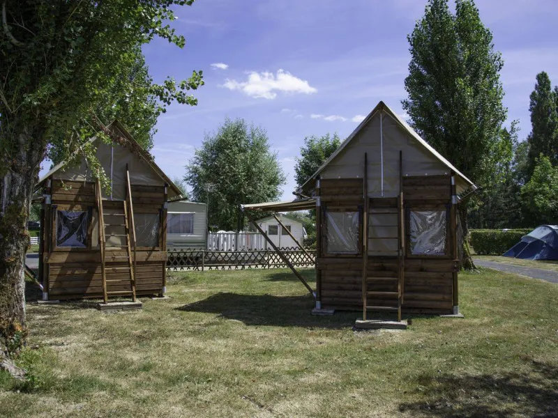 Lodges for 5 persons with a living room opening onto a covered terrace (2 bedrooms, kitchenette, 20L water supply and electricity).