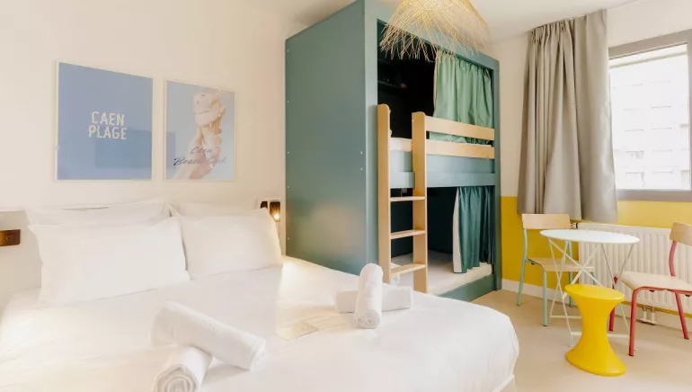 Our hostel on Caen's Presqu'île will surprise you with its "Miami Beach with crème fraîche" atmosphere.