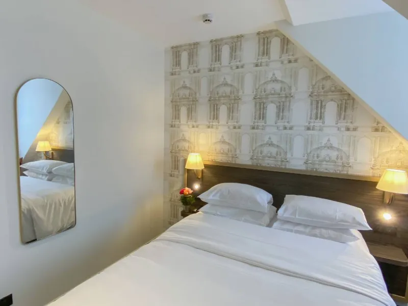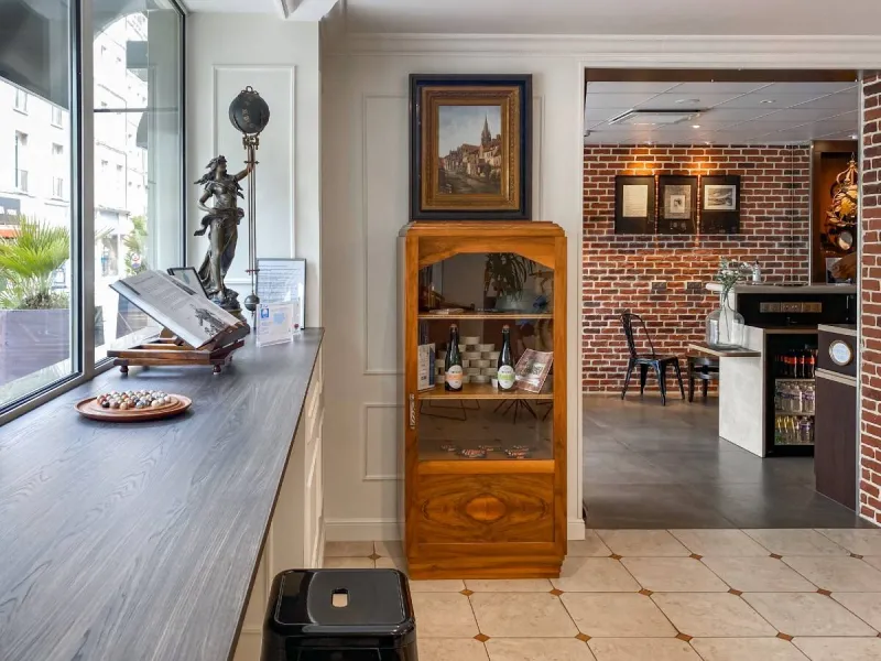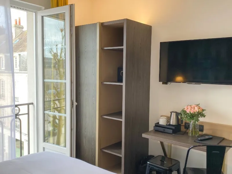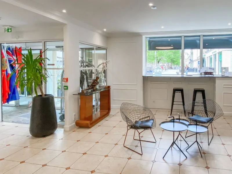 Opposite the emblematic Place de la République, in the immediate vicinity of Caen's pedestrian precinct, theatre, congress centre and restaurants.The decor is balanced between sobriety and elegance, highlighting a few royal symbols to bring you closer to our history.