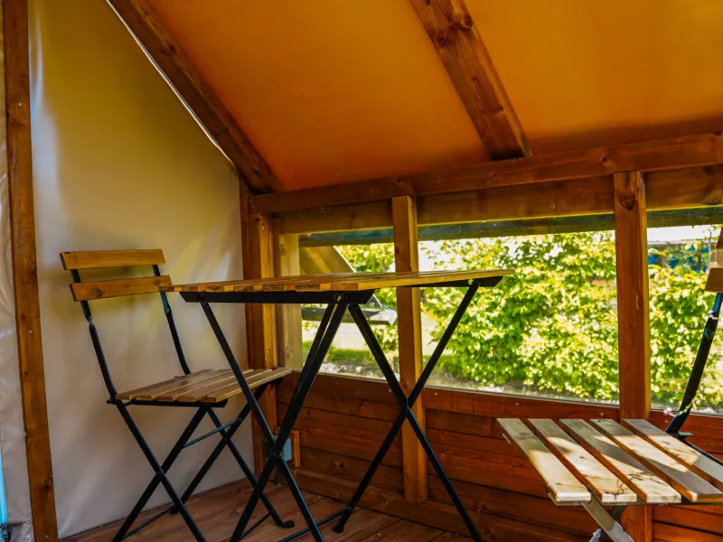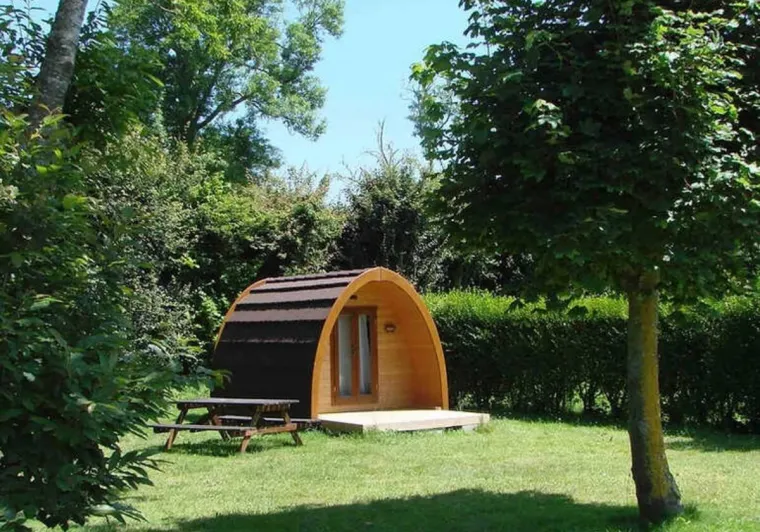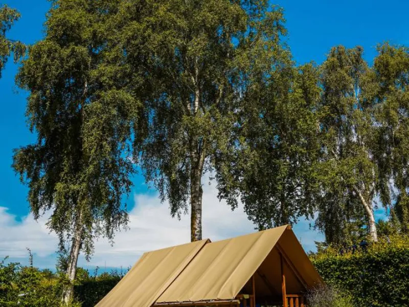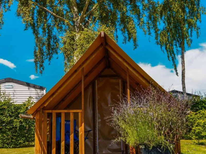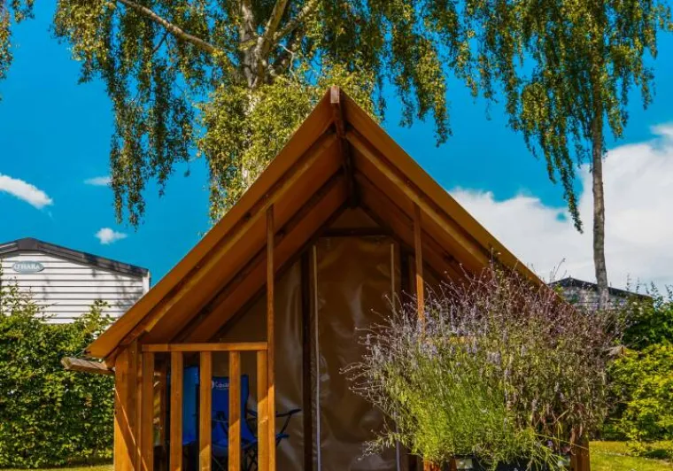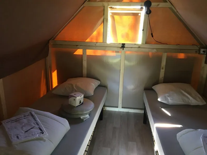 Sleep in a Cyclo'tente at Camping des Bords de l'Aure in Bayeux. This tent structure, half wood / half canvas on a floor, has 2 single beds (also available in a single model) and is equipped with electricity (European plugs). A plus for cyclists: bikes are sheltered at the back of the hut in a bike box.A must for travelling light on the Vélomaritime.