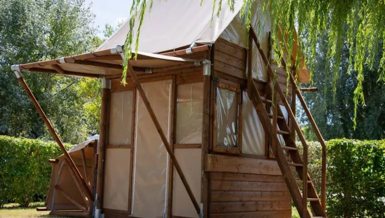 The advantage: sheltered dining under the sleeping area. This unusual accommodation is ideal for a cycling trip. The campsite is ideally located on the edge of the lake of Pont l'Evêque and 2 minutes from the town centre, in a 90-hectare wooded park. With family or friends, for a restful or sporty stay, enjoy the beach, swimming and activities (in July and August).