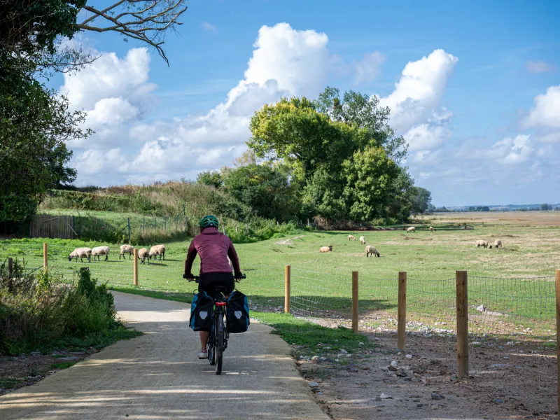 🆕 Via een nieuwe, veilige route kunt u nu Ducey-les-ChĂ©ris bereiken. Tussen La Rive (Pontorson) en Bas-Courtils (Courtils) zijn twee prachtige stukken groene route aangelegd, met onder meer een uniek fietspad langs de baai, midden tussen de zoutvlakten.