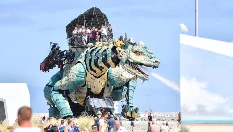 A monumental mechanical animal made of steel and wood, the Dragon de Calais spits fire, smoke and water in different forms. It can lie down, get up and run. Passengers climb on its back and stroll on a covered terrace thanks to a staircase built into its tail. Every day, he walks along the waterfront, embarking up to 48 people for a journey of about 45 minutes (boarding and disembarking included). Bicycle parking, secure charging station for EAB, inflation station, luggage lockers... Numerous services for a quiet ride.