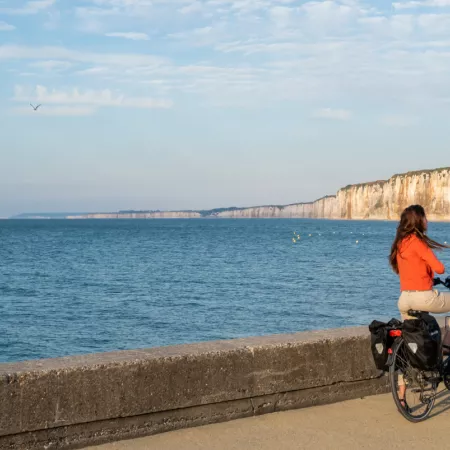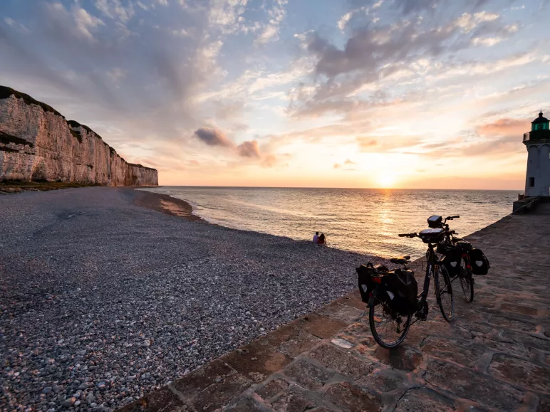 Du Havre, ville inscrite au patrimoine mondial de l’Unesco à Fécamp, cité des ducs de Normandie, l’itinéraire sillonne la Côte d’Albâtre. Avec ses valleuses et ses falaises de craie blanche, c’est un véritable enchantement situé entre la baie de Seine et la baie de Somme ! Sur le parcours, Étretat est la perle de ce littoral. De Fécamp à Dieppe, la Côte d’Albâtre continue d’étonner. Sur cette partie se succèdent de charmants villages de pêcheurs, des stations balnéaires reconnues et l’un des plus beaux villages de France... En selle pour une balade entre culture et nature sur la Côte d’Albâtre !