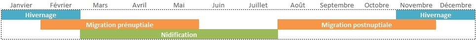 En hiver, les canards démarrent leurs parades nuptiales et amorcent leur migration vers le nord dès janvier. Au printemps, la nidification s'intensifie, suivie par les premiers envols jusqu'en juin. En été, les rassemblements d'oiseaux se multiplient, tandis que la migration postnuptiale se déroule en fin août et septembre, et la migration d'automne se termine avec les oies cendrées ou rieuses en novembre.
